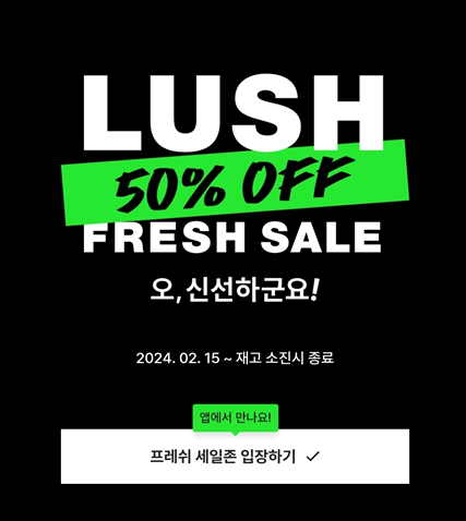 - 2024 프레쉬 세일은 15일부터 재고 소진 시까지 러쉬코리아 공식 앱과 전국 매장에서 진행되니 오프라인 이용 가능