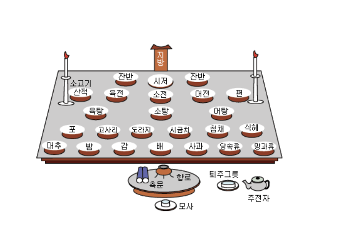 - 제상 앞에서 제5줄에 과실, 제4줄에 찬, 제3줄에 탕, 제2줄에 적, 제1줄에 반, 갱의 순서로 진설한다.
