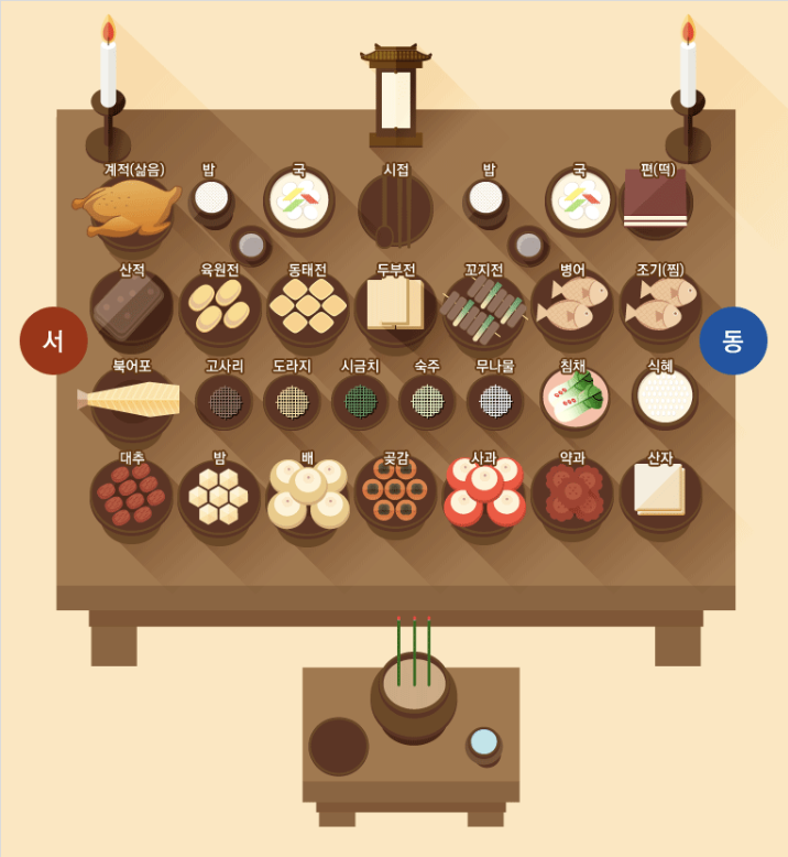 - 기타 : 지역에 따라 곡물류(콩,팥)이나 추가 디저트를 놓기도 합니다.