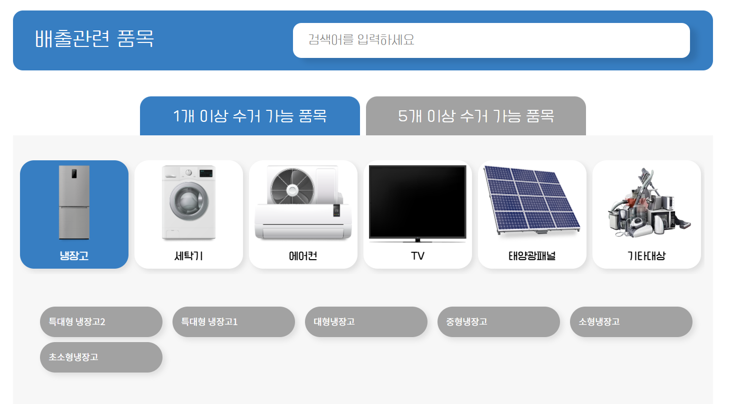 - 배출을 원하는 가전제품 목록에서 해당 품목을 선택(예 : 냉장고, 세탁기, TV, 전자레인지 등)